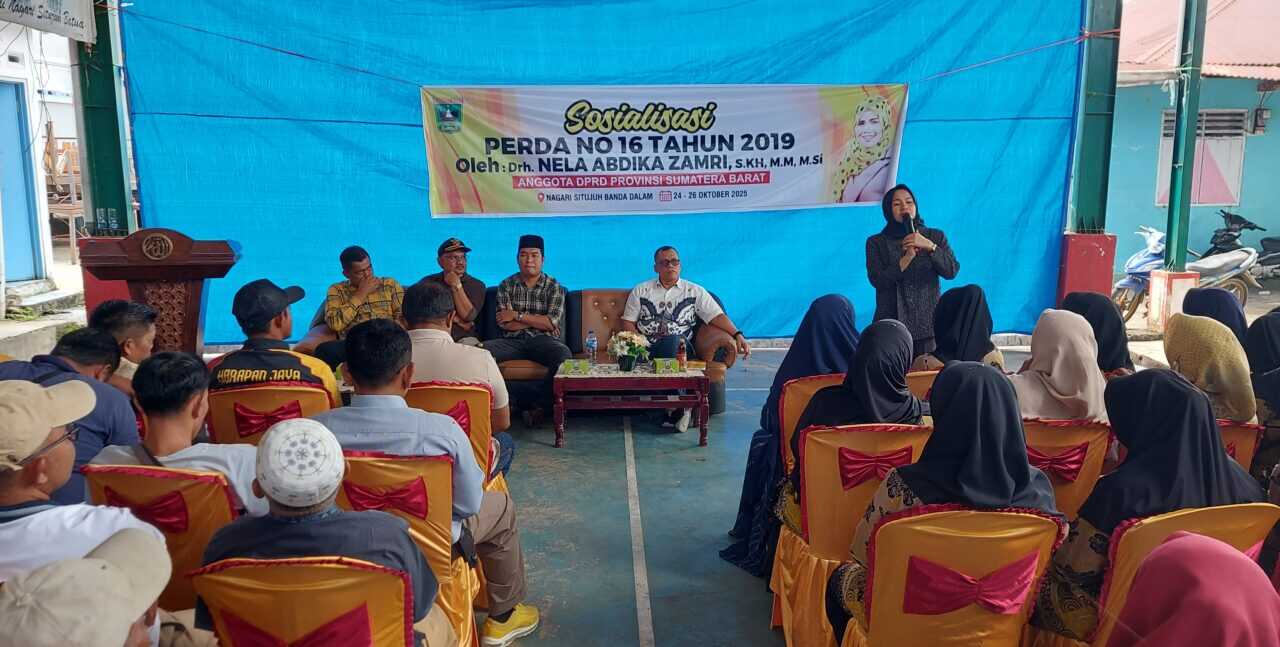 kabarita.com — Anggota Dewan Perwakilan Rakyat Daerah (DPRD) Provinsi Sumatera Barat (Sumbar) Komisi III drh. Nela Abdika Zamri, menggelar kegiatan reses sekaligus sosialisasi Peraturan Daerah (Perda) Provinsi Sumatera Barat Nomor 16 Tahun 2019 tentang Pemberdayaan dan Perlindungan Koperasi dan Usaha Kecil. Acara itu berlangsung di Nagari Situjuah Batua, Kecamatan Situjuah Limo Nagari, Kabupaten Limapuluh Kota, Minggu (26/10), dihadiri kurang lebih 200 orang konstituen dari dua nagari, yaitu Situjuah Batua dan Situjuah Banda Dalam.